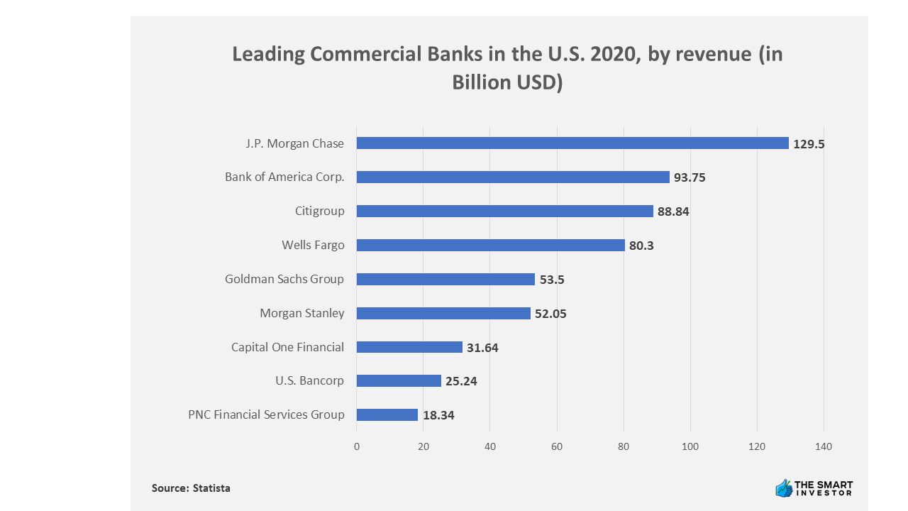 Data compiled by Statista in 2020 of the top 10 largest banks in the United States by revenue ranked JPMorgan Chase in the first position with $129.5 billion. Bank of America Corp took the second position with $93.75 billion, a notable 38.13% short of JPMorgan’s. From the bottom-up, PNC Finance Service Group took 10th place with $18.34 billion in revenue.
